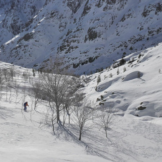 Beaucoup d’autres possibilités à ski sont observables dans le vallon. En toutes expositions, du Monte Albanu au Capu Falu et de belles combes en rive droite. Retour par la piste sous les belles couleurs crépusculaires des Cinque Frati (Cinq Frères) et fin de journée à Albertacce chez Jean-Marie pour constituer les stocks de charcuterie et fromages de la ferme.
